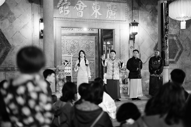 11月2日,观众在广东会馆入口处观看演员表演。位于天津市南开区的广东会馆有百余年历史,是天津戏剧博物馆的所在地。近期,该会馆引进了沉浸式互动戏剧项目“百年有戏 大河向东”,通过知识解谜、手工拼图、模仿动作、登台演出等形式,让观众以深度体验的方式参与其中。项目推出一个月来,吸引众多观众走进这座百年戏楼,感受戏剧艺术的魅力。 新华社记者 赵子硕 摄
