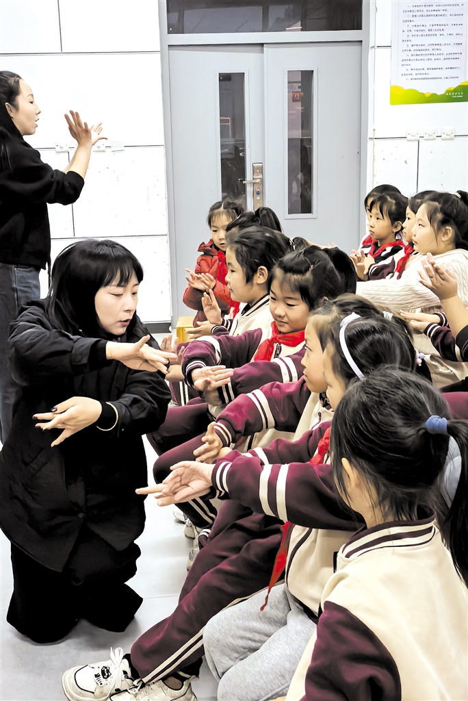复兴小学戏曲课堂上,靳思维、李晓老师指导孩子学习戏曲手势“小五花”。 董岑 摄
