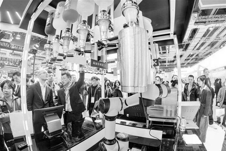 这是11月6日在第七届进博会技术装备展区西门子展台拍摄的AI迷你调酒工厂。 新华社记者 张铖 摄