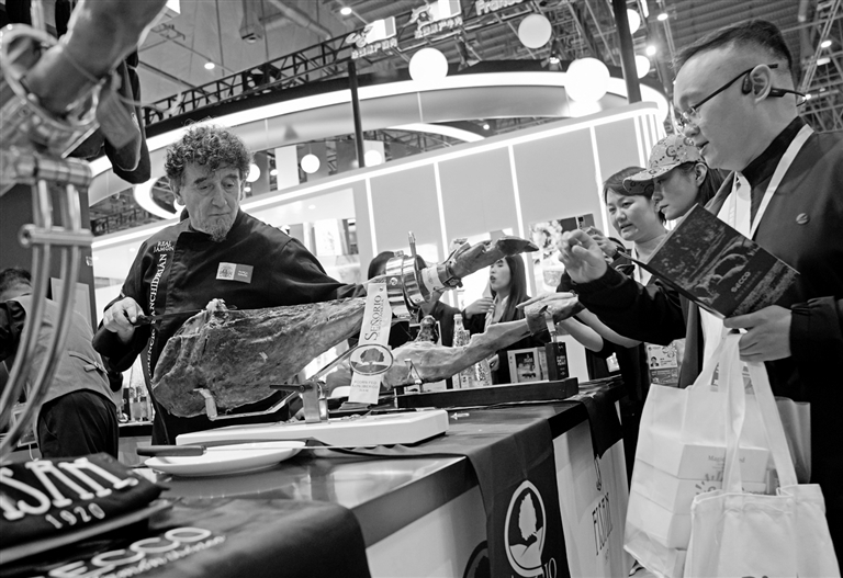 11月6日,在第七届进博会食品及农产品展区,观众在品尝西班牙火腿。 新华社记者 刘颖 摄