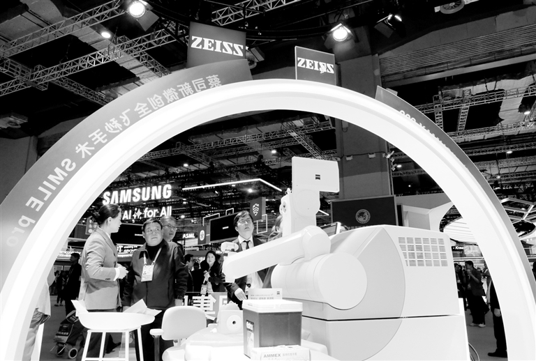 11月6日,参观者在蔡司公司展台展出的新一代机器人全飞秒前交流讨论。 新华社记者 方喆 摄