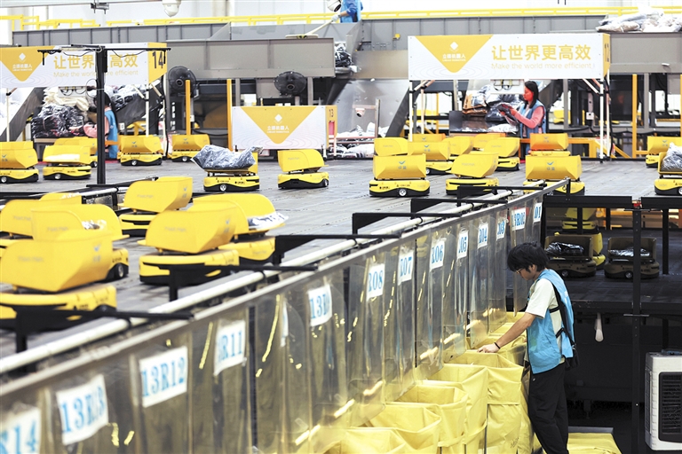 11月7日,浙江省湖州市德清县乾元镇第一产业智慧物流园区快鱼服饰有限公司华东物流中心,工人在封包分拣“小黄人”机器人配送的服饰。 “双十一”临近,全国各地生产企业开足马力、备足货源,物流企业腾仓扩容、增强运力,迎接“双十一”购物高峰。 新华社发(倪立芳 摄)