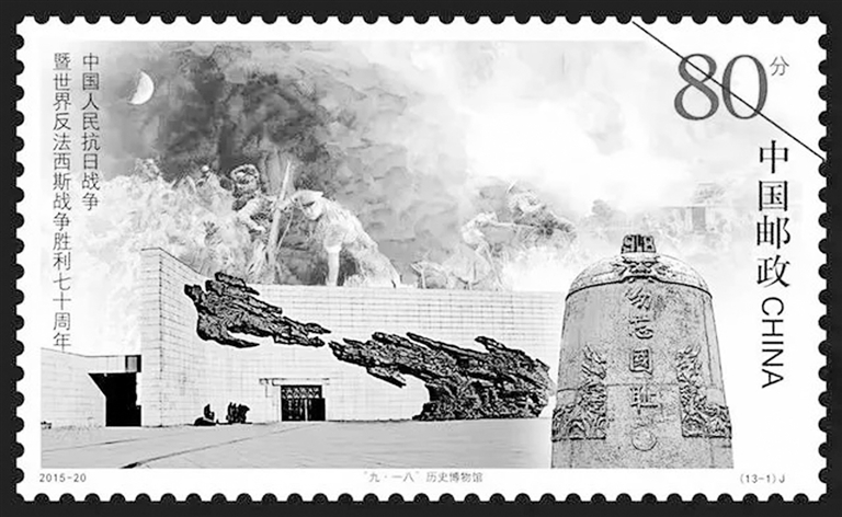 这是李晨设计的《中国人民抗日战争暨世界反法西斯战争胜利七十周年》纪念邮票中的一枚。