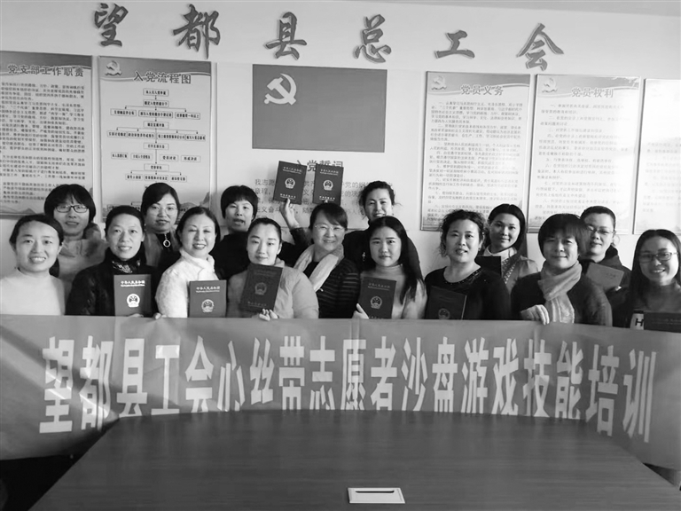 田晓丽(前排右2)组织开展“心丝带”志愿者沙盘游戏技能培训。 受访者供图