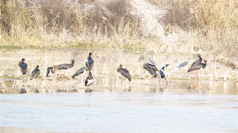 成群的黑鹳在浅水处觅食嬉戏。