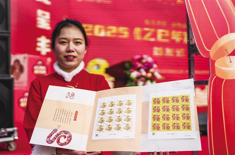 中国邮政1月5日发行《乙巳年》特种邮票。《乙巳年》特种邮票以敦煌壁画和传统民俗为灵感来源,将蛇的形象与吉祥寓意巧妙结合。邮票一套两枚,图案名称分别为“蛇呈丰稔”“福纳百祥”。这是1月5日,工作人员在贵阳市黔灵山公园展示《乙巳年》特种邮票。 新华社记者 陶亮 摄