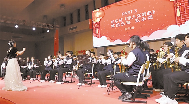 ▼日前,保定市宏利佳高级中学举行了2025年元旦联欢晚会,用一场视听盛宴点燃了师生心中的热情。此次元旦晚会既是对该校全年文化活动的汇报总结,又是对2024年的温暖回首,更是对2025年的憧憬和展望,为宏利佳学子的学习和生活营造了浓厚的艺术氛围。图为该校管乐团合奏《欢乐颂》。 臧玉玲 报道