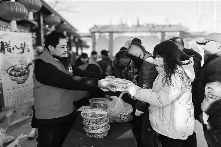 在定兴县南祖村店村,志愿者为村民送上腊八米。 郝建利 摄