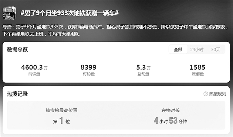“男子9个月坐933次地铁获赠一辆车”的话题登上热搜。