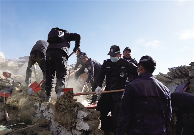 1月7日,救援人员在定日县长所乡古荣村进行搜救。 新华社记者 晋美多吉 摄