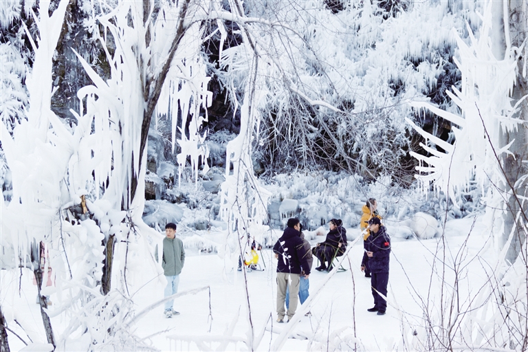 游客来到夏庄村冰瀑纷纷打卡拍照。