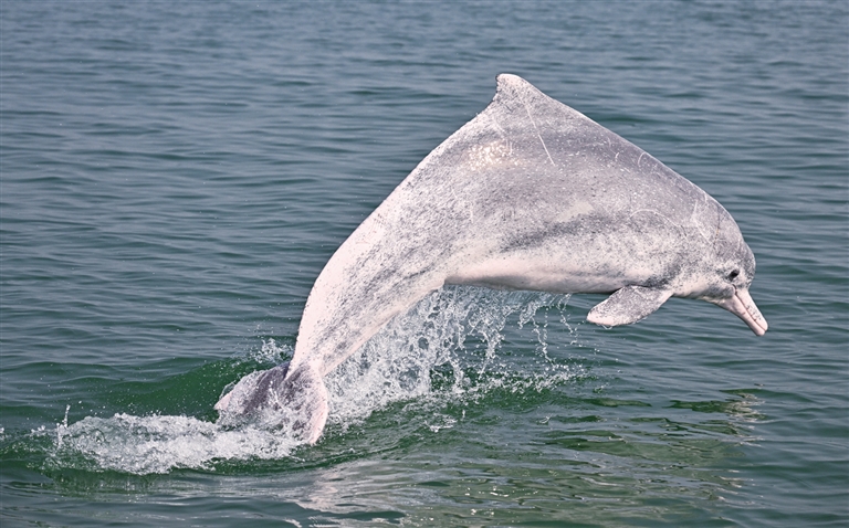 这是1月6日在三娘湾附近海域拍摄的跃出海面的中华白海豚。 在广西钦州市毗邻228国道的三娘湾和大风江口海域,栖息着一群中华白海豚。它们是国家一级保护野生动物,2008年被列入世界自然保护联盟濒危物种红色名录。根据长期在此做调查的北部湾鲸豚研究团队数据,以三娘湾为主要活动区域的中华白海豚种群数量为350-450头左右。中华白海豚常被作为旗舰物种和伞护种,是河口和沿海生态系统的代表物种,它们的生活状态与生态体系的健康程度息息相关。 新华社记者 陶希夷 摄