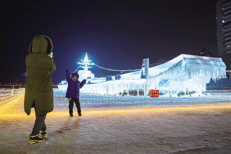 1月7日,在哈尔滨市道外区,游客参观“冰雪辽宁舰”。 近日,冰建景观“冰雪辽宁舰”在哈尔滨道外区百年航运冰雪欢乐世界园区落成,成为游客新的“网红打卡地”。“冰雪辽宁舰”以我国首艘航空母舰辽宁舰为原型,长65米、宽15米、高13米,以一艘驳船为基底,钢结构焊接为支撑,用冰块搭建出外形,起飞甲板、舰桥等航母的典型特征均得到呈现。 新华社记者 谢剑飞 摄
