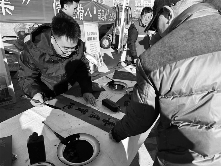 现场,志愿者们将一碗碗热气腾腾、软糯香甜的粥送到村民手中,欢声笑语,情意绵长。笔墨凝香书春意,福字春联映红年。来自区书协的书法家们挥毫泼墨,笔走龙蛇,写满新春祝福的春联和福字跃然纸上。“书法老师字写得真漂亮,过年贴在门上给家里增添节日的喜庆。”手捧字迹遒劲、词语吉祥的春联,王女士喜笑颜开。放眼望去,到处是红红的春联、红红的灯笼,映照着红红的日子、红红的年,浓浓年味儿在墨香中弥漫开来。该区文明办将倡导移风易俗、弘扬文明新风的理念印制在精美的日历上,送到村民手中;医疗志愿者们为村民解答健康疑问,提供专业医疗建议和诊疗服务;反诈宣传和网络安全宣传吸引众多村民驻足,志愿者们向村民发放反电诈宣传材料,通过典型案例、通俗易懂的讲解,普及反诈知识,增强防范意识,守护村民钱袋子。