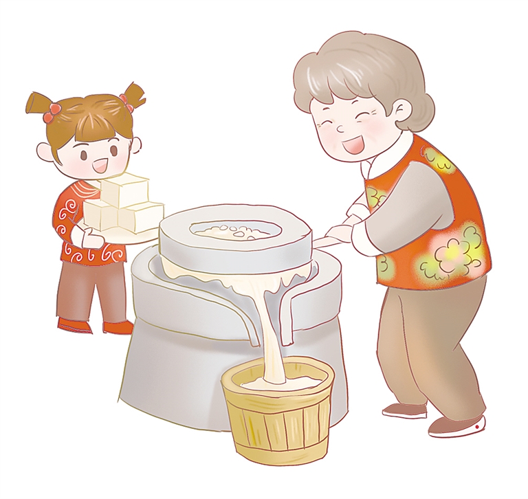 腊月二十五左右,父亲要炸年货了,这是我最喜欢的。炸年货之前先要做豆腐摊饹馇,父亲会叫上我跟着他去晃磨。磨是赵叔家的,整个南街只此一家。豆子已经被父亲提前泡好、揉碎、去皮,浸在清水里。磨放在一间小屋里,房梁上垂吊下两根绳,绑在磨把两端。我前腿绷,后腿弯,双手紧握横着的磨把,父亲则一只手轻扶着磨杆,一只手拿着勺子舀起连汤带水的豆子,放进磨盘上的小洞里。随着磨盘吱吱扭扭地转动,乳白色的豆浆顺着磨壁流下来,一股绿豆的清香漾满小屋。