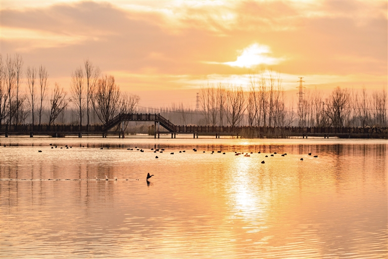 夕阳西下,高阳龙湖湖面波光粼粼,宛如一面金色的镜子,倒映着天空与岸边的景物。成群的鸟儿在湖面上嬉戏,或游弋或飞翔,为静谧的湖面增添生机与活力。 蒋东良 摄