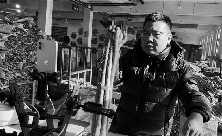 千寻供应链管理有限公司工作人员正在直播销售麻山药。 马妍 摄
