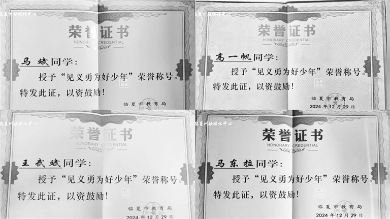 ▲临夏市教育局为4位少年颁发的荣誉证书。