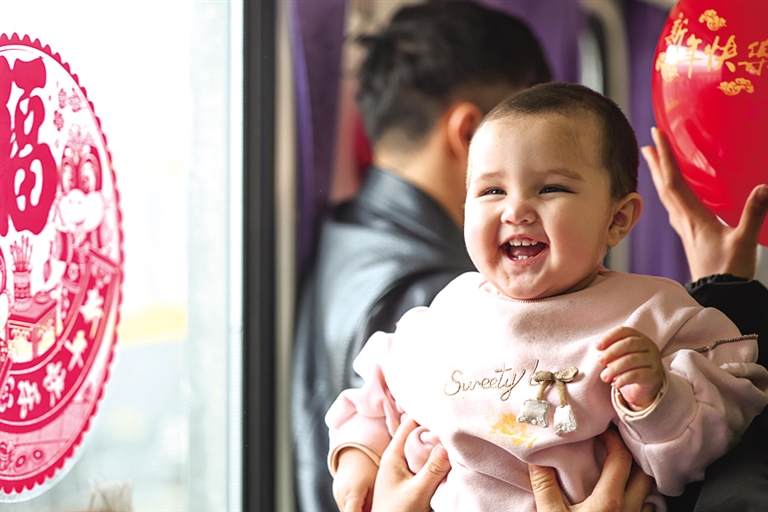 在7557次列车上,一名小朋友在和家人玩耍(1月2日摄)。临近春节,南疆返乡客流日渐增长,7556/7557次绿皮车受到许多旅客的青睐。被沿线居民亲切称作“小慢”。票价最低仅有4元的“小慢”,是沿途学生的“校车”,也是农牧民外出务工的“班车”。 新华社记者 王菲 摄