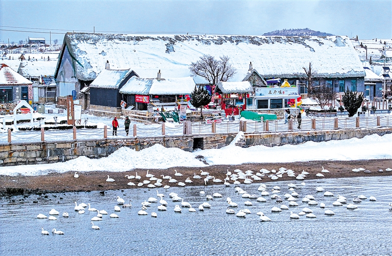 1月9日,在山东省荣成市俚岛镇烟墩角村海湾,成群的大天鹅在栖息、觅食。受冷空气影响,多地迎来降雪天气。 新华社发(李信君 摄)