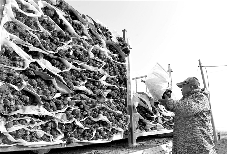 2024年12月26日,河南省焦作市温县祥云镇关肇村农民将收获的铁棍山药装车。 新华社记者 郝源 摄