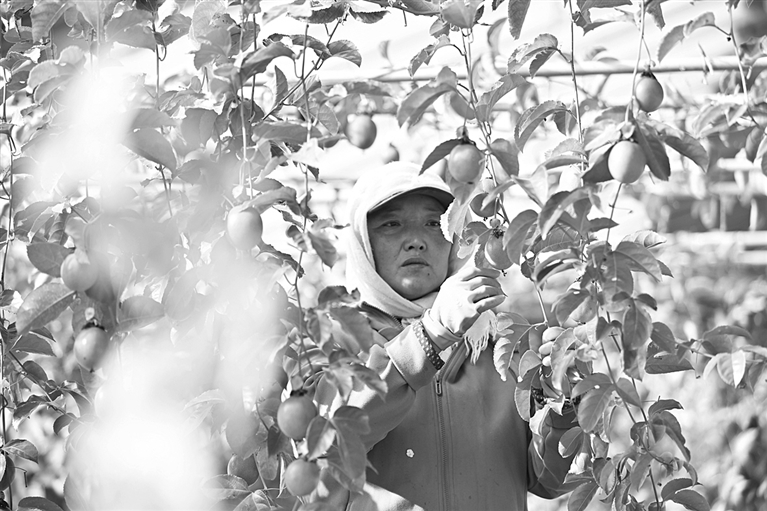 2024年12月26日,工作人员在固原市原州区彭堡镇姚磨村“南果北种”设施温棚查看百香果生长情况。 新华社记者 王鹏 摄