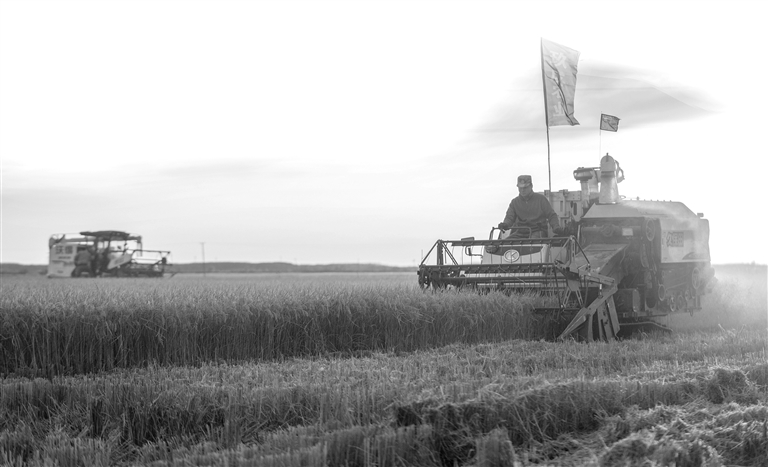2024年10月11日,农机在黑龙江省佳木斯抚远市玖成水稻种植专业合作社的稻田进行收获作业。 新华社记者 王建威 摄