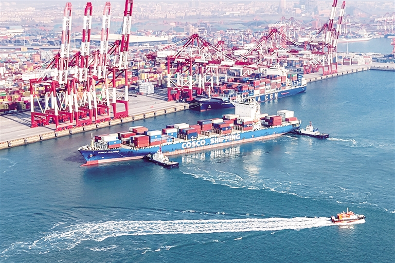 1月13日,在山东港口青岛前湾港,装载外贸集装箱的货轮停靠码头(无人机照片)。 1月13日,海关总署发布数据显示,2024年,我国货物贸易进出口总值43.85万亿元,同比增长5%。中国外贸经受住多重挑战,规模再创历史新高。 新华社发(俞方平 摄)