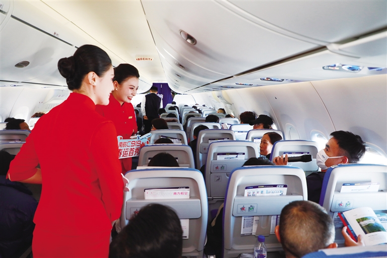 1月14日是2025年春运第一天,中国南方航空3架C919国产大飞机全部投入春运,执行广州往返杭州、上海虹桥、海口、成都天府4条航线的10个航班。 新华社记者 王瑞平 摄