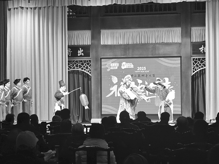 “台上的戏曲老师们表演得太精彩了,看得带劲儿,听得过瘾,回味无穷!”观众席里不仅有老戏迷的身影,也有被戏曲惊艳的年轻一代,学生刘圆圆和朋友久久不愿离场,她说,“在古戏楼听一场戏,很有氛围,年味儿一下就来了。坐在台下能清晰地看到演员脸上的表情,听到每一句念白,让人动容,逐渐和戏中人产生跨越时空的共鸣,感觉和戏曲的距离更近了。”