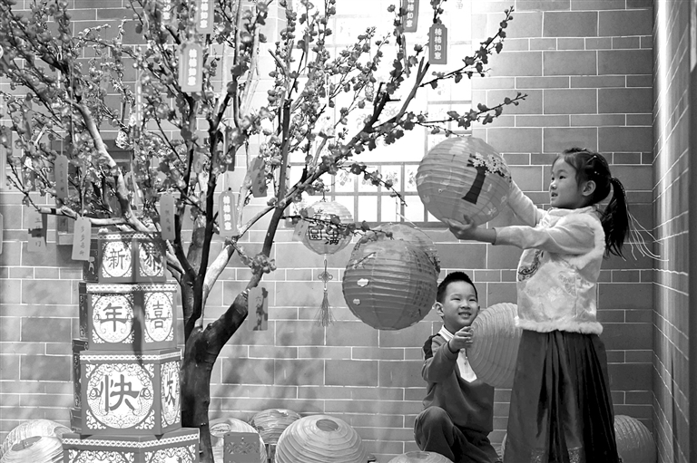 1月16日,小朋友在河北省群众艺术馆迎新春民俗文化展活动中悬挂灯笼。当日,河北省群众艺术馆(河北省非物质文化遗产保护中心)举办“瑞蛇贺岁 喜乐纳吉”迎新春民俗文化展和系列民俗体验活动,吸引市民前来体验参观,提前感受年味。 新华社发(陈其保 摄)
