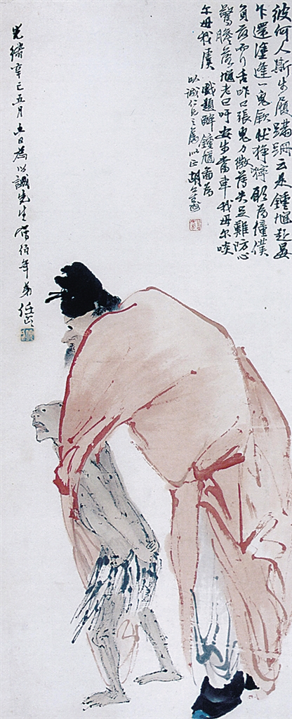 武汉博物馆收藏了一件清代海上画派名家任颐的《醉钟馗图》,画心起手有清晚期书画家胡公寿题跋,道出了画意主题:“彼何人斯?步履蹒跚,云是钟馗,赴宴乍还,途逢一鬼,厥状狰狞,愿为童仆,负荷而行。舌咋口张,鬼力微薄,失足难防,心惊胆落。馗老曰吁,安步当车,我毋尔啖,尔毋我虞。戏题醉钟馗画,为以诚仁兄之属以正,胡公寿题。”