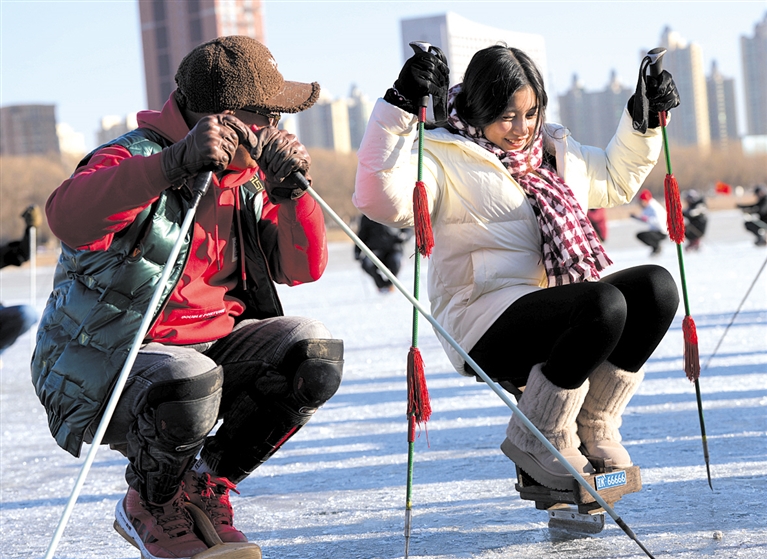 1月15日,辽宁省辽阳市太子河的冰面上,一名年轻人(右)学习骑行“单腿驴”。入冬以来,许多冰上运动爱好者来到辽宁省辽阳市太子河的冰面上享受骑行“单腿驴”的快乐。“单腿驴”是单刀冰车的俗称,是东北地区常见的一项群众冰上娱乐健身活动。 新华社记者 李钢 摄