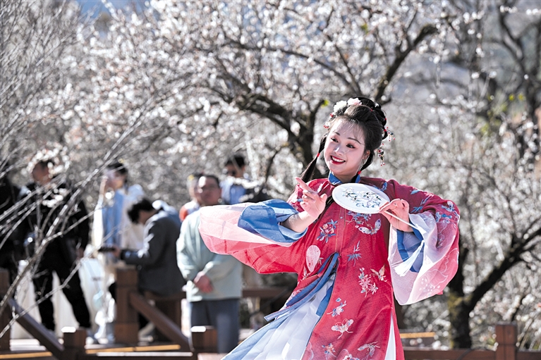 1月17日,身着传统服饰的女士翩翩起舞。福建省福州市永泰县正值青梅开花时节,当日,以“花前乐下 此时最美”为主题的国风雅集冬日赏梅季在该县葛岭镇文埕湾梅林正式启动。永泰县将青梅等特色种植产业作为文旅经济发展的新载体,持续推进观光、体验、文创、研学等产业发展。 新华社记者 姜克红 摄
