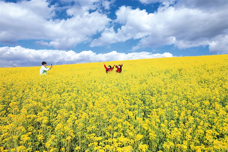 1月7日,在腾冲市明光镇凤凰村凤凰山油菜种植园中,盛开的油菜花吸引游客前来赏花游玩。数九寒天,云南一派“冬暖花开”的缤纷景象吸引了各地的人们走进彩云之南,开启一场与春天的约会。 新华社发(龚祖金 摄)