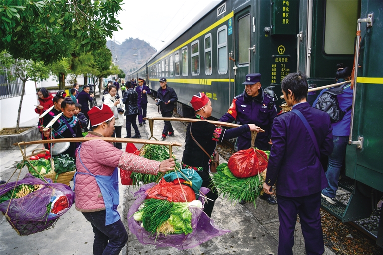1月18日,在沪昆铁路六个鸡火车站,村民准备登上5640次列车售卖蔬菜和年货。 往返于贵阳与玉屏之间的5640/39次列车,是一趟穿行于贵州少数民族地区、逢站必停的“慢火车”。自1997年开行至今,为沿途10多个小站附近的100多个少数民族村寨村民提供了便宜、便利、快捷的出行方式。 新华社记者 杨文斌 摄