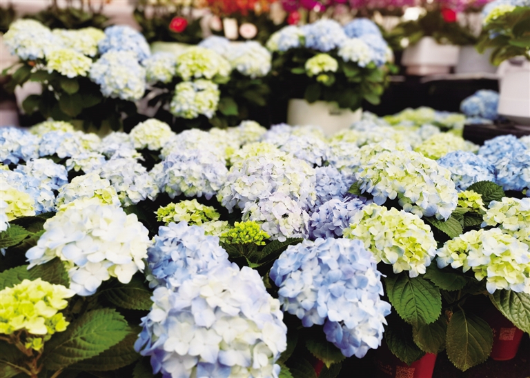 窑上村花卉市场也是同样的场景。蝴蝶兰五彩斑斓,多肉玲珑乖巧,杜鹃娇艳欲滴,金橘挂满枝头……一片绣球打造出的“莫奈花园”令人眼前一亮,正在招呼客人的摊主说:“绣球花团锦簇,看着就喜庆!”还有扎堆的水仙花球,吸引不少市民驻足询价,期待素雅娟丽的“凌波仙子”送来春的消息。