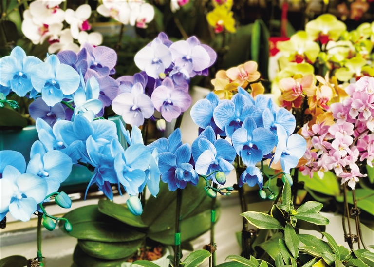 在竞秀公园南门口的竞秀花卉市场,目之所及皆是琳琅满目的各色花卉。其中当之无愧的“顶流”,非蝴蝶兰莫属。除经典粉、白、紫外,新奇色调纷纷登场,蓝色清新雅致,橙色洋溢活力,把不同年龄层的顾客都轻松拿捏。一位从事十余年花卉经营的摊主热情介绍:“蝴蝶兰向来是最受欢迎的,相较于往年,今年更加缤纷,人工培育出各种色彩,满足不同顾客的需求。”她告诉记者,自家摊位的蝴蝶兰主要来自我市定兴县和山东的花卉基地。