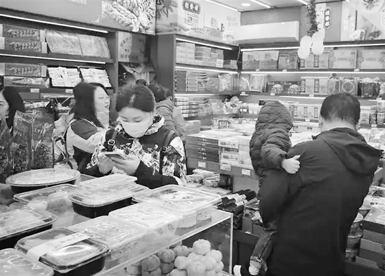 市民游客在天津古文化街桂发祥和果仁张“联合店铺”选购产品。 新华社记者 隋福毅 摄