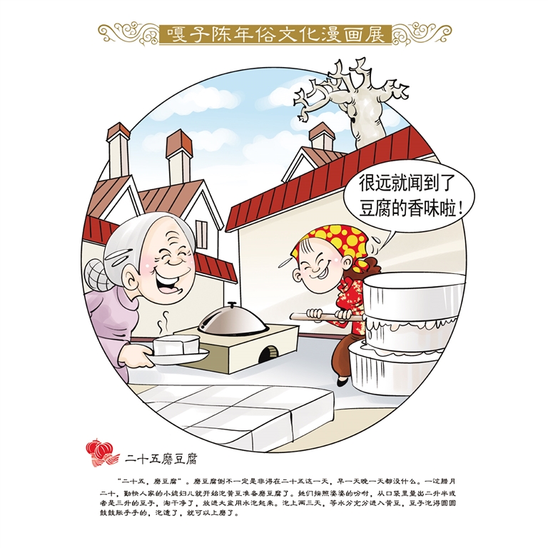 二十五磨豆腐,“腐” 与 “福” 谐音,磨豆腐意味着一种祈福,祝愿新的一年福气满满。在腾腾热气中,蒸蒸日上的生活画卷也徐徐展开。 嘎子陈(陈永亮)绘