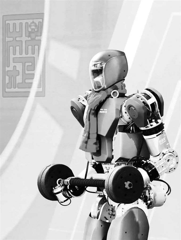 人形机器人在湖北“全省加快建成中部地区崛起重要战略支点推进大会”上展示负重技能(2025年2月5日摄) 新闻周刊 肖艺九 摄