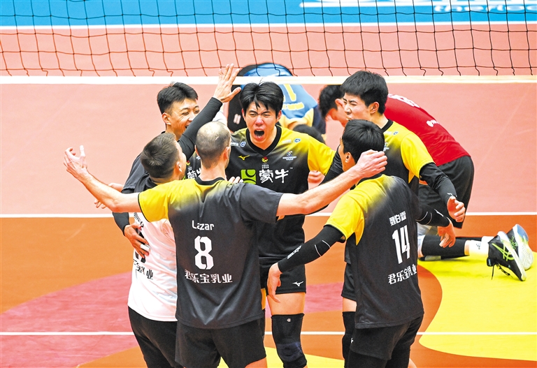 2月27日,在2024-2025赛季中国男子排球超级联赛(A级)半决赛第二回合比赛中,保定沃隶队客场3比0战胜天津食品集团队,总比分1比1战平。最终,在“金局”(决胜局)中,保定沃隶队15比13战胜天津食品集团队,晋级决赛。图为保定沃隶队球员庆祝得分。 新华社记者 孙凡越 摄
