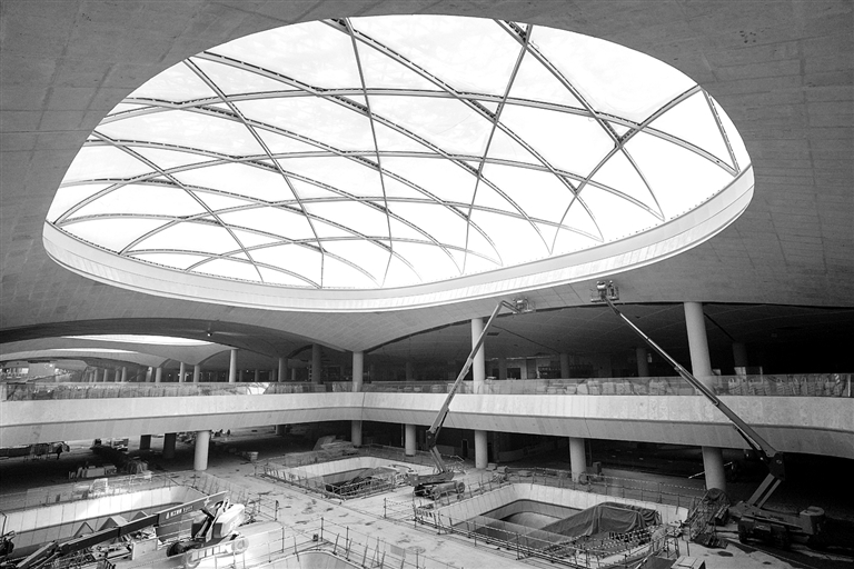 施工人员在北京城市副中心站枢纽工程内部施工(2月26日摄)。北京城市副中心站综合交通枢纽工程是京津冀协同发展交通标志性工程,目前已实现主体基本完工,正在进行设备安装、装修装饰和运营筹备等工作,计划于2025年底基本建成。 新华社记者 鞠焕宗 摄