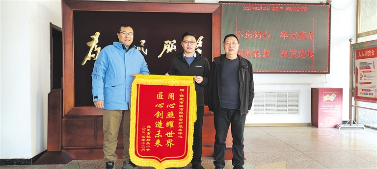 保定晚报讯(记者耿静 通讯员刘怡清 贺彦飞)2月26日,保定市城市照明管护服务中心收到一面来自 舫头小学的锦旗,上面写有“用心照耀世界,匠心创造未来”字样,这面锦旗背后,是城市照明管护服务中心铁东维修所积极践行“三个延伸”工作,为学校师生解决实际困难的暖心故事。