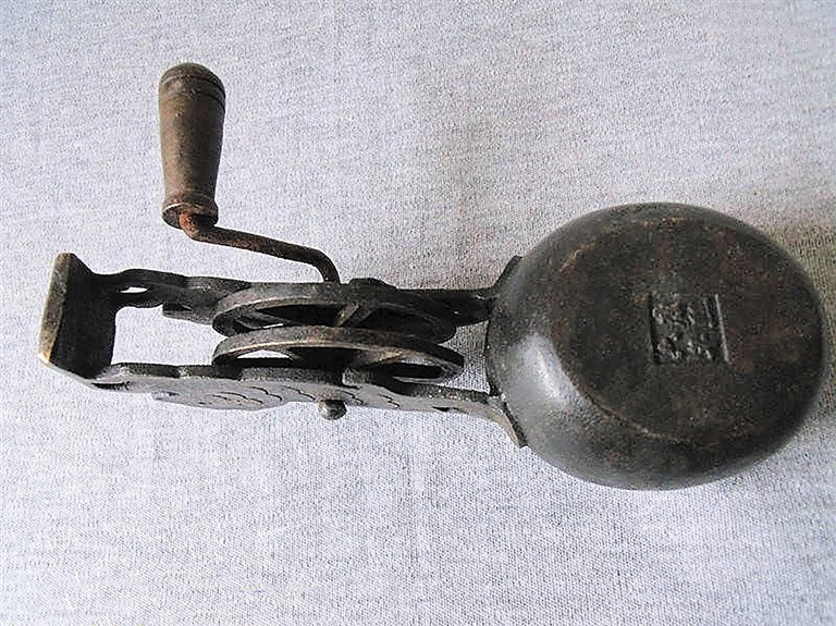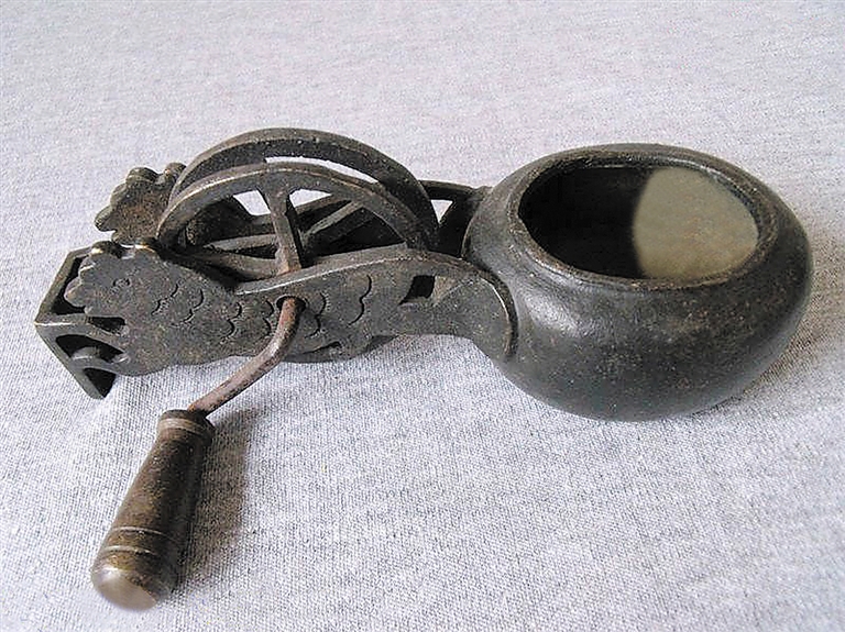还有一件是双虎纹铜墨斗,制作于清中期,材质为黄铜,长14.5厘米,宽5.5厘米,高5厘米,器形古朴,有黑色包浆。此墨斗设计得很精巧,线轮槽外壁各雕一只萌虎,造型简约,栩栩如生。两只萌虎大张着嘴,目视前方,拉着罐状的墨仓,撒开四蹄肆意奔跑。中间的线轮高于线轮槽两壁雕刻的萌虎,摇柄把上刻有两道弦纹。翻转墨斗,可见“康熙六年”4字阳文楷体款识。这件双虎纹墨斗做工精巧,雕刻娴熟,包浆自然,品相完美,由于年代久远生有铜锈,但并没有掩盖其光芒,反而为其增添了一丝岁月沧桑的厚重感,让人爱不释手。