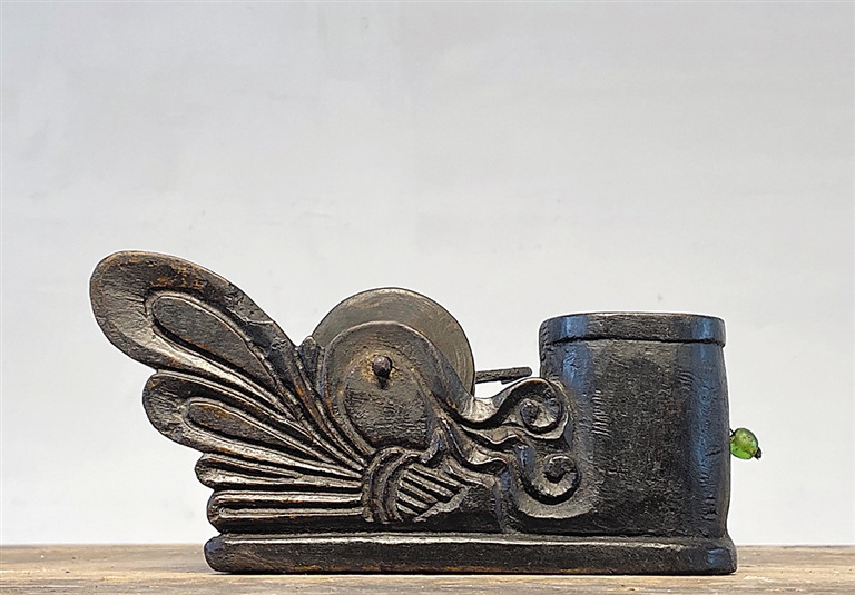 我在藏友处见到两件老墨斗,一件是木雕墨斗,制作于清代,材质为楠木,长18厘米,宽5.5厘米,高9厘米,由一整块楠木料手工雕凿而成,墨仓呈鼓状,线轮槽两壁雕成一对羽翼丰满的鸟。只见那对鸟儿紧紧依偎在一起,似久别重逢的情侣在诉说衷肠。它们的头部虽然只是用线条简单地勾勒,但显得气韵生动,活灵活现。尾部的翎毛排得整整齐齐的,越往上越大,像孔雀开屏,又像花儿绽放,美不胜收。墨线头缀着一颗绿珠子,给暗红色的墨斗带来一抹清新的色彩。这件墨斗雕工精湛,木质细腻,制作规整,线条流畅,包浆莹润,保存较好,时代特征鲜明,至今还可使用,颇为难得。