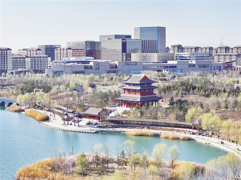 这是雄安新区金湖公园内的仿古建筑群(3月16日摄,无人机照片)。