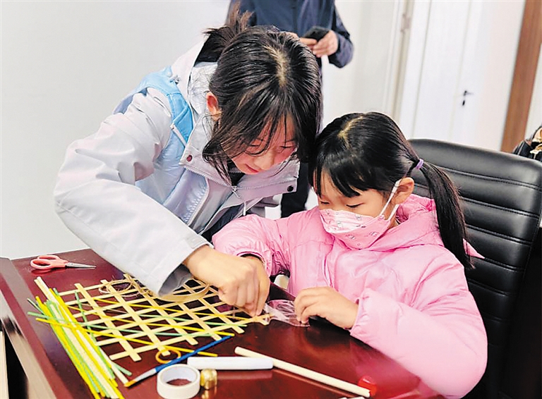 志愿者带领孩子制作竹编风铃。 刘迪 摄