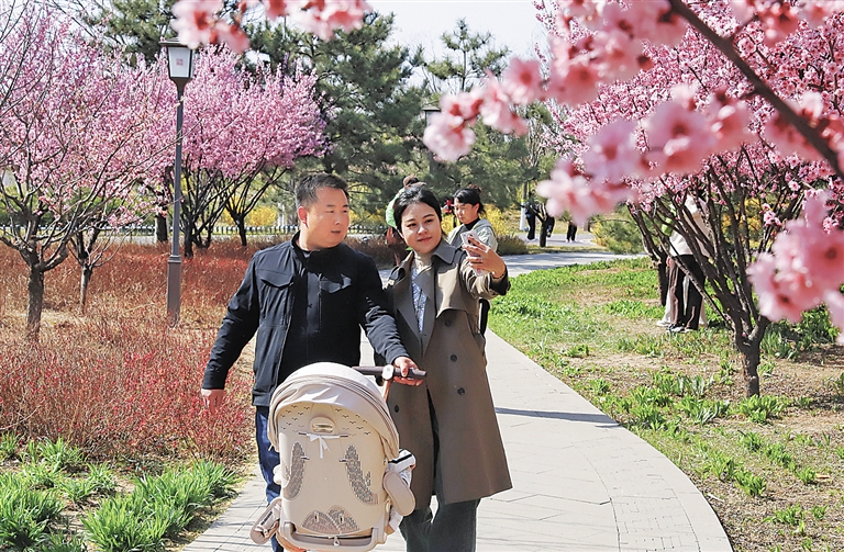 一家人漫步在小径上享受春日美好,是雄安人触手可及的幸福日常。