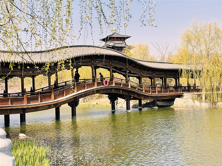 宋韵十足的木质廊桥横跨碧波之上,垂柳依依相伴。